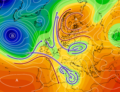 Lo schema evolutivo della situazione conferma i movimenti già esaminati in precedenza facendo un disegno assai interessante e suggeritore di spunti. Presenta un contesto poco lineare in senso zonale e che vede protagonisti sulla scena continentale una azione retrograda ed una azione atlantica, nel letto di correnti di segno opposto e, nello stesso tempo, solo parzialmente tendenti ad interazione positiva. I relativi movimenti globali o di traslazione, sovrapposti ai corrispondenti movimenti vorticosi intrinseci, vedono l’infiltrazione atlantica muovere verso sud-est ed entrare in mediterraneo, e l’azione continentale muovere in senso retrogrado verso nord-ovest sull’europa centro-settentrionale. Si tratta di due azioni che indicano una distribuzione barica e dei forcing poco favorevole ad una vera e propria fasatura e che, nel contempo, portano a scomodare importanti concetti di fisica dell’atmosfera collegati a vorticità relativa, planetaria, assoluta ed a conservazione della vorticità assoluta, che non è il caso qui di approfondire oltre ma che vanno tenuti sempre presenti quando si vogliano esaminare e capire certe dinamiche meteo. L’azione atlantica, in movimento verso latitudini più meridionali, alimenta la relativa vorticità ciclonica destinata a determinare una fase sulla penisola meno stabile o più variabile; l’azione retrograda continentale, che invece muove verso latitudini più settentrionali, vede alimentata una fase di vorticizzazione scandinava di segno opposto o anticiclonico ed un forcing generale che favorisce la tendenza, della azione ciclonica medesima, ad essere fagocitata dal flusso atlantico principale sull’alta europa. In qualche modo, e come detto, tutto questo avrà riflessi mediterranei non troppo positivi, ma neanche troppo negativi per come avrebbero potuto essere nel caso di una franca fasatura con conseguenti più significativi approfondimenti ciclonici. Il disegno si riferisce alla possibile situazione generale dei giorni 13/14 e mostra le figure suddette in azione con, dettati dal supporto della simbologia, la loro intrinseca vorticità e i loro movimenti traslatori, con la diminuzione della pressione mediterranea e la possibilità di una fase, più o meno breve, di generale destabilizzazione. A seguire, poi, vedremo se la medesima figura depressionaria tenderà, per come dicono le attuali proiezioni, ad indebolirsi muovendo verso levante ed a favorire nuovi rialzi barici nonché una nuova possibile fase relativamente stabile…