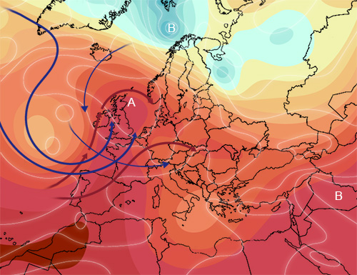 Questa fase di grande caldo andrà avanti ancora per qualche giorno; poi la configurazione che la sostiene comincerà a vacillare e la sua storia, sulla base di due step successivi di differente fisionomia, dovrebbe concludersi. Ho detto dei due step. Il primo, inquadrabile nell’immediato dopo ferragosto è quello che vede una rimonta di alta pressione verso le isole britanniche con conseguenti moderate riduzioni bariche in mediterraneo destinate, quanto meno, ad allentare la compressione adiabatica foriera del grande caldo. Il secondo, inquadrabile in dirittura di fine seconda decade, è quello di un ravvivato flusso atlantico capace di agganciare l’esteso cut-off atlantico impantanato ad ovest della rimonta anticiclonica sopra indicata, e capace anche, di muovere la relativa saccatura verso sud-est sino, si spera, a ridurre, poi ed ulteriormente, l’ondata di caldo e l’onda sub-tropicale responsabile. Il mio disegno si riferisce alla situazione generale prevista intorno ai giorni 16/17 ed identifica la maturazione del primo step sopra indicato. La simbologia, a sua volta, intende rappresentare tutta l’evoluzione, che va dal presente (freccia rossa continua) al primo step (freccia rossa tratteggiata) ed al secondo step (frecce blu)…