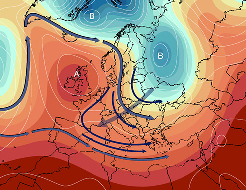 La configurazione anticiclonica che domina l’area mediterranea e, soprattutto, l’europa nord-occidentale, si caratterizza con un profilo simil omega che tiene, per ora, a distanza, sia il flusso atlantico che la minaccia della depressione dell’europa orientale. Di fatto quest’ultima ha finito per risultare meno influente di quanto precedentemente ipotizzato, con il risultato di un tempo relativamente stabile anche sui nostri settori adriatici. La fuga di una infiltrazione retrograda è quella che, nel corso dei giorni scorsi, ha disegnato una falla in sede iberica foriera di instabilità su quelle aree e, attualmente, di sviluppi di aree temporalesche significative tra baleari e spagna occidentale che, però, dovrebbero rimanere sul posto o, comunque, non propagarsi verso oriente. La componente in quota, infatti e su quell’area lungo il fianco occidentale dell’alta pressione dinamica, è modesta e meridionale. Va altresì detto che detta componente, sulla base di un certo cambio di circolazione prossimo futuro, dovrebbe diventare occidentale, a costituire il classico flusso secondario nell’ambito di una configurazione simil split-blocking, certamente possibile foriera di una fase più o meno instabile per il mediterraneo centro-meridionale. Tutto, infatti, concorre nella direzione di una certa persistenza del profilo anticiclonico attuale, ma concorre anche, nel contempo, nella direzione di una estensione retrograda o verso sud-ovest dell’area ciclonica dell’est e nella direzione, in buona parte conseguente, di una certa diminuzione della pressione in quota sulla fascia mediterranea centro-meridionale, appunto. Da cui la classica ritornante delle basse latitudini, estesa dall’iberia all’egeo, ed in qualche modo, collegata anche alla porta dell’atlantico. Con la diminuzione della pressione sull’europa nord-occidentale, vedremo poi se, in direzione di fine seconda decade, si potrà avere un ulteriore cambio circolatorio con infiltrazioni dal nord-atlantico capaci di destabilizzazioni sulla penisola più estese. Il disegno mostra la situazione generale prevista intorno a metà mese e mostra, con il supporto della simbologia, lo split, ovvero il ramo principale del flusso atlantico sbarrato e deviato verso nord ed il ramo secondario sopra descritto che corre lungo la spagna ed il mediterraneo meridionale. E mostra, nel contempo, l’estensione verso sud-ovest della configurazione depressionaria dell’europa centro-settentrionale in grado di coadiuvare o marcare la medesima corrente instabile occidentale del basso mediterraneo…
