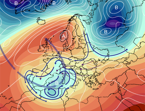 L’inverno sta decidendo, finalmente, di fare l’inverno, con modi che si confanno perfettamente ad una delle più classiche delle situazioni della stagione. Tale situazione, che maturerà gradualmente nel corso proprio dei giorni intorno al natale, forse non sarà tale da enfatizzare chissà quali estreme fantasie freddiste, ma, di sicuro, servirà a proporre qualcosa che con l’inverno ha parecchio a che fare. Lo sviluppo, su scala continentale, di un rex-blocking, non è qualcosa, comunque, che, per il mediterraneo, definisce un solo contesto meteo. Ne definisce vari ed a seconda di tanti parametri, di carattere dinamico, termico ed in relazione alla disposizione degli stessi centri barici. In questo caso definisce, oltre che, certamente, il tipico contesto con alta pressione di blocco tra vicino oceano e scandinavia e fascia depressionaria balcanico-mediterranea, la misura di un afflusso freddo quanto meno moderato e di matrice orientale. La faccenda è bene fissata dal disegno della situazione prevista proprio nel giorno di natale, frutto del prolungarsi di una ampia saccatura groenlandese sino sull’iberia, simboleggiata dalla freccia grande, con associato moderato polo freddo in quota, e frutto della contemporanea rimonta di alta pressione dinamica a costituire il menzionato blocco. Tipici, allora e come avviene in questi casi, l’apparente rotazione antioraria dell’asse della saccatura e lo split, a determinare la chiusura ad ovest e lo sviluppo di depressione mediterranea capace di richiamare aria fredda dai balcani e dai quadranti orientali del continente. Vista la situazione depressionaria è certamente da mettere in conto anche un corrispondente quadro di instabilità o di tempo variabile o perturbato, variamente distribuito ma, probabilmente, più presente sul centro-sud e sui settori adriatici. C’è poi anche da dire che situazioni bloccate come questa, in consolidamento nei giorni successivi al natale, non sono facili ad evolvere o a cambiare. Sono, infatti, abbastanza bloccate e tendono a persistere per almeno un pò di giorni, con poche variazioni, al netto, naturalmente, dei piccoli eventuali spostamenti o delle piccole modifiche della circolazione depressionaria. E comunque come detto contesto evolverà nel corso dei giorni di fine anno ed a seguire non è ancora ben definito, anche se si può senz’altro ammettere la non bassa probabilità che il quadro rimanga ad impronta di segno orientale o settentrionale, per un bel pò di tempo…