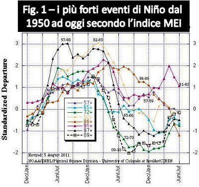 Nella prima figura è riportato l’andamento del MEI durante i più forti eventi di Niño dal 1950 ad oggi (MEI >1).