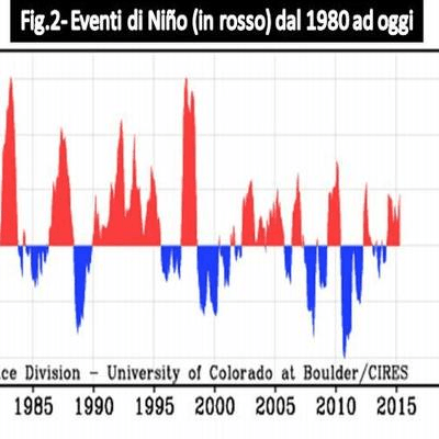 Nella seconda figura invece sono riportato l’indice MEI in tutti gli eventi di Niño (in rosso) dal 1980 ad oggi. Limitandoci solo agli anni 2000, balza evidente come le estati italiane più roventi (2003, 2007, 2009, 2102) abbiano coinciso con un evento di Niño.
