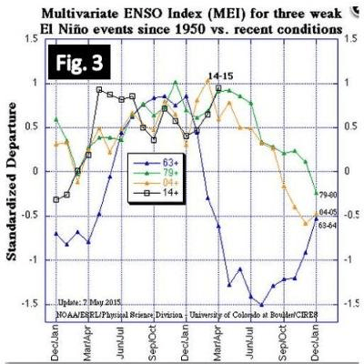 Secondo la Fig. 3 El Niño, se seguisse l’andamento degli eventi che hanno avuto un trascorso simile, potrebbe indebolirsi in giugno-luglio per poi scomparire (MEI <0.5) a fine estate..