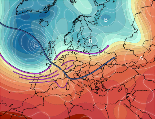 Tra fine mese ed inizio novembre la configurazione euro-atlantica inquadrerà un disegno prettamente occidentale, fatto sia di ovvie correnti umide e relativamente instabili che di una componente sub-tropicale in loro ostacolo. La transizione dalla situazione attuale, sempre oceanica ma tipicamente di nord-ovest, e quella di fine mese, è dettata dal respiro anticiclonico di un modesto promontorio mobile. Ma, come detto, il subentro successivo delle correnti occidentali mosse dalla grande fascia depressionaria atlantica non sarà così franco o incisivo. Lo sarà, almeno in parte, proprio nei giorni di fine mese, ma, forse, tenderà ad esserlo di meno a seguire. E questo per effetto di una fascia sub-tropicale tendenzialmente più intrusiva e persino in grado di disegnare un promontorio, seppur forse temporaneo, frenante. Non siamo ancora nell’ambito di certezze in quanto un siffatto gioco delle parti non è mai di facile interpretazione, nel senso che l’equilibrio può risultare più o meno deviato a favore delle correnti atlantiche o del sub-tropicale. In ogni caso si conferma quanto già intravisto in precedenza, con la possibilità che, però, alla fine ed in base a quanto dicono le carte attuali, il lungo termine possa vedere, piuttosto che rimonte da vero blocco, sfondamenti, più o meno destabilizzanti, da ovest. Il disegno mostra la situazione generale prevista per il finale del mese e che inquadra perfettamente il contesto sopra descritto, mentre la simbologia delle frecce, da blu a viola, intende rappresentare la transizione delle correnti in quota, da quelle attuali nord-occidentali associate a veloci transiti instabili nord-ovest/sud-est, a quelle strettamente da ovest del possibile peggioramento di fine mese e, tendenzialmente, più o meno ostacolate dal sub-tropicale…
