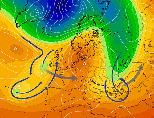 I forecast ora intravedono, nel medio-lungo termine, la tendenza verso un ritorno di correnti occidentali. L’attuale relativo dominio anticiclonico, dalle caratteristiche di un blocco ad omega, lascia il fianco orientale ad una influenza negativa o tipo depressionario, peraltro marginale e destinata alla parte orientale della penisola, mobile ed in veloce transito verso sud o sud-est. Ma i riflettori generali cominciano a guardare ad ovest, segnalando un anticiclone destinato ad entrare in una fase di stanca nel corso dei primi di maggio. Il veloce allontanamento della saccatura dell’est, per nulla orientata ad affondare in senso retrogrado, ma forzata, invece, ad allontanarsi verso levante, è già, in tal senso, una indicazione. C’è poi una saccatura a largo, in atlantico, che tenderà a muovere verso est, destinata ad entrare in fase con il vortice che, tutt’ora, si sta muovendo sul continente in senso retrogrado. Le due figure non mancheranno di delineare una temporanea configurazione ad occhiale, con il vortice continentale più a nord che, nel suo percorso verso ovest e nord-ovest, andrà rallentando, e con la figura depressionaria oceanica menzionata, più a sud, che andrà spostandosi in senso zonale. Tali movimenti sono elementi di una generale dinamica indicativa proprio del possibile cambio meteo di inzio mese, che, al momento, non sembra ancorato ad un rientro in scena di correnti umide occidentali così rapido e così marcato, ma che sembra, comunque, ancorato a spinte in grado di erodere il fianco occidentale dell’alta pressione e di portare, verso penisola e mediterraneo, profili barici di segno moderatamente negativo. Per confermare la faccenda nei suoi esatti termini c’è, peraltro, tempo, e, naturalmente, vedremo. Il disegno, con il supporto della simbologia, mostra la situazione generale ed i movimenti tendenziali previsti nell’immediato inizio del mese; segnala il transito della saccatura dell’est su adriatico e penisola balcanica, capace di incentivare, su parte della penisola, un quadro di instabilità, soprattutto diurna; segnala la configurazione ad occhiale che va delineandosi in atlantico e che prelude alla fasatura suddetta; e segnala la tendenza della stessa figura depressionaria oceanica a guadagnare, poi ed in longitudine, verso levante…