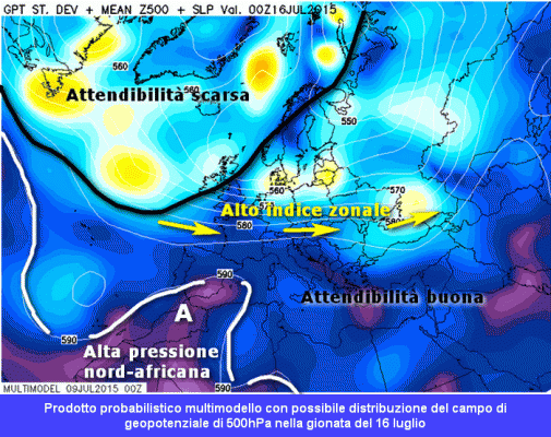 Sino al weekend abbiamo già delineato la linea di tendenza. Ora procediamo a dare una prima occhiata al materiale probabilistico, per cercare di dare una fisionomia alla linea di tendenza successiva, arrivando sino a 7 giorni (giovedì 16 luglio).