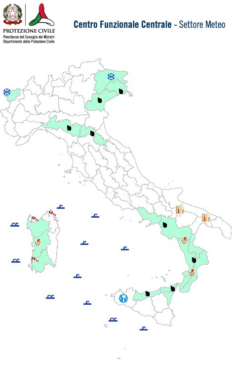 Precipitazioni: isolate, anche a carattere di rovescio, su Sicilia nord-orientale e centrale tirrenica, Calabria, Basilicata tirrenica, settori costieri della Campania, Sardegna occidentale, Appennino emiliano-romagnolo, settori costieri del Veneto e Prealpi venete, Friuli Venezia Giulia e Valle d’Aosta, con quantitativi cumulati generalmente deboli.