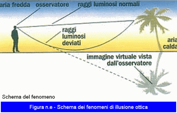 In tal caso l’effetto, dovuto alla presenza di un condotto atmosferico nato da un’inversione termica (mare più freddo dell’aria soprastante) ci riconduce ad un altro fenomeno simile d’illusione ottica: la Fata Morgana (Figura n.2)