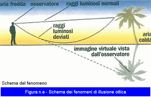 Morale? Le immagini che vediamo di norma sopra l’orizzonte (paesaggi e/o oggetti) vengono riflesse (e rovesciate), dandoci la sensazione della presenza al suolo di altri oggetti, posti in posizione curiosa all’interno di questi fantomatici, quindi in realtà inesistenti “laghetti”. Nasce i miraggio, ovvero l’effetto che produce l’illusione ottica della presenza di oggetti che non esistono (figura n.1).