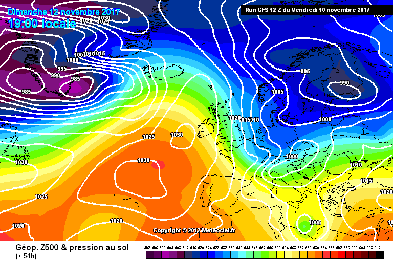 FIG.1 mappa dei geopotenziali a 500hpa (5500 metri) valida per domenica 12 novembre ore 19:00, i colori tendenti al blu indicano la massa di aria instabile in procinto di entrare dalla porta del Rodano a ovest Fonte: meteociel.fr