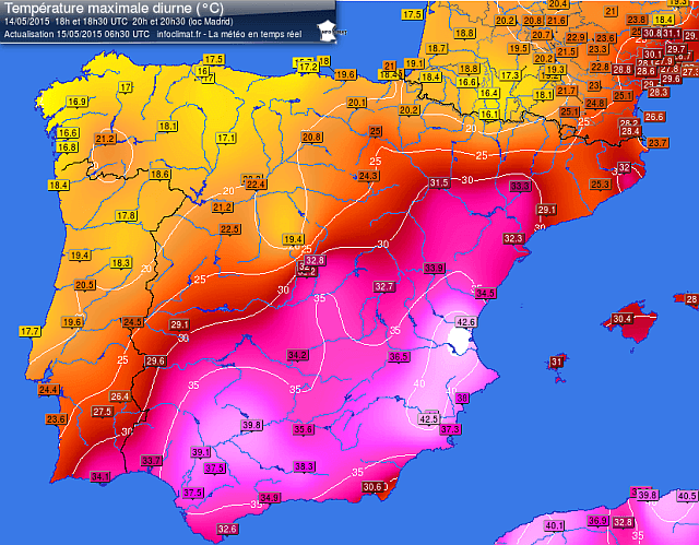 Tutte queste temperature sono superiori al precedente record mensile di caldo europeo che era stato stabilito solo 7 giorni prima (il 7 maggio 2015) da Catenanuova con 41,9°C. Il record pre-2015 apparteneva ad Andujar, altra località spagnola, con 41,7°C.