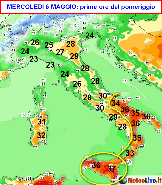 Il grosso della fiammata bollente si sposterà sulla Sicilia e sulle regioni estreme meridionali (segnatamente Puglia, Lucania e Calabria).