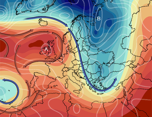 Significativo ed insistente il blocco che sta governando il tempo su buona parte del continente. Il medesimo si configura nella forma approssimativa di un omega, disponendo i suoi massimi sul nord-atlantico e sull’europa nord-occidentale, ed accogliendo il supporto di un promontorio iberico-mediterraneo. In questo modo e con la associata latitanza delle azzorre il contesto euro-oceanico risulta quello assai meridiano di una fascia anticiclonica sul continente, settore centro-occidentale, e di due ampie saccature ai suoi lati, quella assai fredda dell’europa orientale e quella atlantica che affonda sino alle basse latitudini dell’atlantico portoghese. La persistenza di una siffatta situazione è fisiologica e risiede nella dinamica propria di tale profilo. Ammette possibilità di sfoghi da est o da ovest, legati alle due saccature sopra indicate, ma non così facilmente. Da questo punto di vista una maggiore influenza sulla penisola della saccatura orientale è da mettere in conto per i prossimi giorni, certamente con un pò di venti da levante più freddi, ma sempre con modi marginali, e senza l’incisività delle vere irruzioni. Semmai, ed alla luce di quanto ci dicono i modelli, è da considerare, ai fini di un futuro declino della stessa alta pressione, quanto spinge da ovest o dall’atlantico. Attualmente la componente traslatoria di tale spinta è trascurabile, tant’è che la relativa saccatura sfoga piuttosto lungo i meridiani, producendo estensioni verso sud e rimanendo molto a largo. Si vede come, guardando il disegno della situazione prevista intorno ai giorni 9/10 e in conseguenza di rimonte anticicloniche anche in oceano, finisca per maturare in un cut-off o depressione isolata, certamente insidiosa per la penisola iberica ma non per noi. A seguire, anche se con molta gradualità, non è poi da escludere, che detto cut-off, eventualmente agganciato da un atlantico più energico, possa guadagnare verso levante a corrodere il blocco e ad introdurre qualcosa di più attinente ad infiltrazioni da ovest…