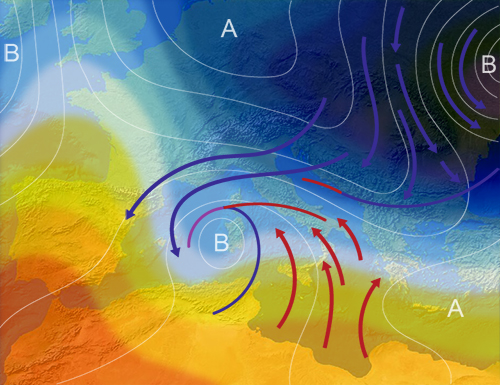 Se gli appassionati di meteorologia come il sottoscritto guardano, oltre che alle vicende italiche, alle evoluzioni meteo su larga scala e al loro significato, molti meno appassionati o non così seguaci della meteo più tecnica, giustamente guardano a cosa potrà accadere alle proprie regioni, in termini non di isoipse o di isobare, ma di nudi e crudi fenomeni. Ebbene accadrà, molto probabilmente ed intanto, che avremo un afflusso di aria fredda. Non sembra che si tratterà di una grande ondata di gelo o che la bella sacca fredda irromperà franca in mediterraneo. D’altra parte eventi di poli freddi o saccature di diretta origine artico-continentale che coinvolgono in modo diretto il mediterraneo sono assai rari. Meno rare, invece, sono le discese di tali sacche lungo l’europa orientale, lungo i balcani, in grado di sfiorarci o di coinvolgerci in modo parziale. E quanto sta per accadere è molto probabile che possa corrispondere ad una situazione del genere, ovvero ad una moderata o discreta ondata di freddo in grado di apportare una fase, più o meno breve, di venti di grecale e di temperature sotto media. E’ evidente che ogni volta che accadono fatti del genere non può, chi è amante della neve che imbianca pianure e colline, non sperare che tale freddo possa anche corrispondere ad un fatto precipitativo del genere. Ed allora, vista una certa evoluzione, mi sono divertito a disegnare quella che potrebbe, e dico potrebbe, essere la situazione tra venerdi 12 e sabato 13, certamente di un certo interesse proprio per coloro che sperano in un episodio invernale precipitativo. Ho detto che la depressione attualmente in transito è da considerare di chiusura, ed è da considerare sostanzialmente di chiusura perché rappresenta l’ultimo atto di un treno di perturbazioni atlantiche organizzato. Ciò che non esclude, però e per come sembra nelle probabilità, la possibilità di uno strascico infiltrativo che potrebbe generare una ulteriore moderata depressione mediterranea disposta inizialmente sul medio tirreno proprio tra venerdi e sabato. Alla luce della irruzione contemporanea, che vede il travaso verso sud di una sacca fredda in quota e di aria fredda di avvezione veicolata anche al suolo dalla bella alta pressione relativa e di blocco più o meno temporaneo sull’europa centro-settentrionale, è evidente che una depressione del genere potrebbe, non solo favorire un maggiore richiamo di aria fredda ed una maggiore tendenza retrogressiva del blocco freddo, ma potrebbe anche innescare una fenomenologia precipitativa inizialmente sui versanti tirrenici e tale, naturalmente oltre una certa latitudine italica da verificare, a carattere di precipitazione nevosa a bassa quota. Non ci sono certezze in situazioni del genere, e la previsione a carattere regionale o locale la lasciamo volentieri agli esperti; ma è chiaro che la speranza di vedere, su alcune zone d’italia e a bassa quota qualche fiocco, non è così illusoria. Il disegno indica la situazione che vari modelli prevedono per quelle ore o per quei giorni e, con la simbologia dei fronti che io ho immaginato e con le frecce, rende bene l’idea di quanto descritto…