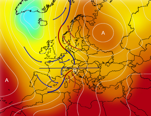 Il fatto che alcuni servizi meteo, nell’arco di 7-8 ore e per certe aree del centro-nord, siano passati, da una previsione di 70-80 mm a quella di 10 mm circa di pioggia, è da correlare ad una evoluzione che ha visto il sistema perturbato mediterraneo assumere la connotazione di un sistema esteso e più stratificato o da nembostrati. In verità questa mattina le coste del centro sono sotto l’effetto di manifestazioni temporalesche, ma, in linea generale, si può senz’altro ammettere che siamo di fronte ad una classica perturbazione autunnale che è maturata in mediterraneo e che è maturata in un sistema piovoso associato, per gran parte del centro-nord, a piogge estese e moderate (è chiaro che, localmente, si possono ancora comunque avere fenomeni alluvionali). L’evoluzione generale in mediterraneo delle ultime 24 ore è davvero interessante e ricca di elementi meritevoli di una discussione e dal valore didattico. Si colloca nell’ambito del tipico affondo meridiano, relativamente ostacolato a levante, e nel cui letto delle correnti meridionali in risalita, si disegna una estesa linea frontale sud-nord, classicamente ondulata per come ragioni di dinamica troposferica tendono ad ondulare i flussi instabili ed a produrre, lungo la medesima linea frontale, onde calde ed onde fredde, nonché fronti caldi e fronti freddi. In proposito si dice, in certi casi, e in relazione ad un fronte freddo, che il medesimo si ondula; come quando una certa situazione, caratterizzata da spinta fredda, si complica o si struttura in una circolazione depressionaria in cui  vengono a coesistere spinta fredda più a sud e spinta calda di segno opposto più a nord. Da cui la doppia onda e lo sviluppo di una perturbazione organizzata, che, se facente parte di un treno di perturbazioni o di una linea frontale ondulata, può anche, nel caso in cui le ragioni della vorticità procedono oltre un certo limite, strutturarsi come perturbazione a sé stante, fino ad arrivare, nel caso più estremo, allo stadio di cut-off. Quanto è accaduto nelle ultime 24 ore in mediterraneo è proprio questo, ed è quello che può accadere in contesti meridiani ostacolati a levante. La lunga linea frontale, in sviluppo lungo una direttrice sud-nord ed in lenta traslazione verso est, incontra condizioni dinamiche che tendono ad isolare la sua parte più meridionale mediterranea che, inizialmente fronte freddo, si ondula e si ondula fino al punto di attardarsi e strutturarsi con un fronte caldo e con un fornte freddo, in una moderata circolazione depressionaria ed in una ben definita perturbazione che, a seguire e nella veste di un esteso sistema piovoso piuttosto che in quella di violenti cluster temporalechi, risale verso nord-est dopo che la medesima linea frontale, nel suo traslare moderato verso levante e con la sua parte più a nord ed anche con la sua instabilità pre-frontale, ha prodotto una precedente fase di maltempo con i cluster temporaleschi e i nubifragi di cui sappiamo (vedi quello di Carrara, e vedi quello dell’Isola d’Elba). Nel disegno, riferito alla situazione di questa mattina, si può notare la lunga linea frontale ondulata su scala europea sopra descritta e dell’affondo atlantico sino al mediterraneo, in cui il fronte della sua parte più meridionale mediterranea, si caratterizza con la doppia ondulazione di un sistema che matura a perturbazione specifica, con una sua propria circolazione depressionaria…