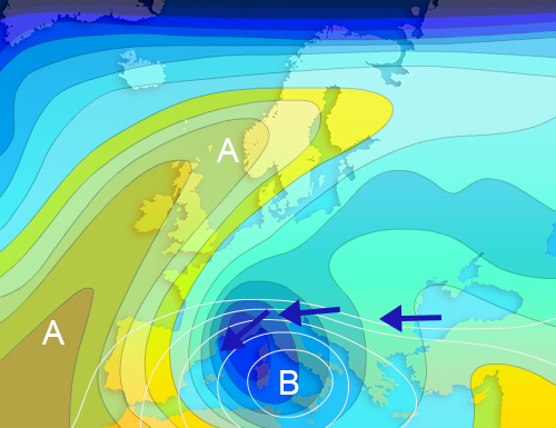 La tendenza dell’artico a scavare più a nord e ad occidente, a partire da questo fine settimana, produrrà la classica depressione mediterranea associata ad una prima diramazione della sacca fredda artica e poi a successivi richiami freddi in quota. Il disegno si riferisce ai primi giorni della settimana, e da l’idea, in un contesto di blocco anticiclonico disposto da sud-ovest a nord-est, della recrudescenza artico-continentale prodotta dal richiamo di un significativo blocco freddo in quota, capace di raggiungere il mediterraneo settentrionale sino ai bacini occidentali e di rinvigorire ed approfondire la medesima depressione centrata sul tirreno centro-meridionale.