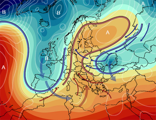 Il tifo, fatto di opinioni e di opinioni opposte, fa parte di ogni settore, che si tratti di sport, di politica e di altro. Certo che in scienza sa davvero di sgradevole e, in nessun caso, quando di scienza si tratta, dovrebbe esserci. La scienza non vive di opinioni, tanto meno di emotività, ma di fatti oggettivi e di prove. E la meteorologia è una scienza; ma, ahimé, intorno alla medesima fioccano opinioni da tifo che è una bellezza. C’è chi, ad es, poiché sostenitore di teorie, prive di prove, sull’arrivo di decenni di freddo e dell’era glaciale, parla di un inverno diverso dai precedenti e ben più freddo. Personalmente, da freddista, spero davvero in un inverno freddo, che, peraltro, nel caso si verificasse non dimostrerebbe, in termini di teorie e di quale futuro, alcunché (lo storico inverno del 1985 spinse non pochi a definirlo l’inizio dell’era glaciale, che, però, non mi sembra sia arrivata). Finora, però, questo inverno ha fornito i fatti oggettivi di un inverno un pò a metà del guado, né troppo mite e né troppo freddo, con qualche sbuffatina artica, moderata, di breve durata, e niente di più. La memoria di chi, per profonda passione, segue bene il tempo sin da bambino e dagli anni ’60, non può non sapere e ricordare a cosa corrispondono i veri duraturi afflussi freddi, ed ovvero quelli che producono, nelle pozzanghere di campagna delle, come nel mio caso, colline pisane di 100-150 mt di altitudine, quel ghiaccio che non fonde mai o che fonde solo in tarda mattinata o nel pomeriggio. In una delle mattine più fredde del recente afflusso freddo passeggiando in campagna non ho notato pozzanghere di acqua che fossero ghiacciate. Ed eccolo il grande afflusso artico che non si vedeva da decenni; ed eccoli i fatti, inconfutabili, naturalmente associati a temperature, si basse ma, di sicuro, non da vero grande afflusso freddo. Ed a proposito di grande inverno ci attende una fase più mite e umida, di quelle in cui giocano un ruolo in contemporanea il promontorio sub-tropicale e l’aria umida atlantica. Niente di più bello per i freddisti. Torneremo ad osservare qualcosa di interessante dopo metà mese o in dirittura di fine decade, quando prenderà quota una configurazione anticiclonica sull’europa nord-orientale, ibrida per la contemporanea sua affermazione in quota ed anche al suolo nelle vesti dell’anticiclone russo-siberiano. Detta affermazione, vista la partecipazione del sub-tropicale ramo afro-mediterraneo, troverà il modo di strutturarsi come il classico blocco ad omega, disposto tra una sacca oceanica che preme in senso meridiano ed una saccatura fredda sulla parte orientale del continente. Tutto questo ce lo racconta il disegno della situazione generale prevista intorno ai giorni 16/17 (frecce medie indicative della situazione a 500 hPa, frecce piccole indicative dei flussi nei bassi strati), che bene detta le condizioni di un gioco di forza tra i protagonisti suddetti, che può anche creare sogni freddisti, ma la cui evoluzione successiva è bene da valutare nel corso dei prossimi giorni, visto che, al momento, la stessa evoluzione appare assai incerta e, semmai, più favorevole alle componenti occidentali (frecce più grandi). Ma vedremo…