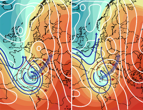 La situazione che va determinandosi è una delle situazioni piovose più classiche, tipiche dell’autunno ma anche della primavera. I clamori, gli allarmismi, i cicloni, le centinaia di mm di pioggia lette qua e là e destinate a sommergere mezza italia fanno parte della letteratura o della meteo romanzata e finalizzata a colpire la folla. In verità gli accumuli di pioggia possibili in certe aree ed in situazioni di questo tipo possono essere marcati, ma, al di là di questo, occorre sempre informare con rigore ed oggettività scientifica. Gli stessi istituti che fanno i calcoli, in casi del genere, fanno previsioni dettagliate ma che tendono a variare di emissione in emissione, perché è oggettivamente complicato prevedere dove si formeranno i sistemi nuvolosi più intensi capaci di creare situazioni alluvionali. Personalmente e naturalmente guardo con frequenza la previsione di pioggia prevista sulla mia zona e persino sul mio comune, rilevando, talora, differenze anche sostanziali tra un servizio meteo ed un altro e rilevando variazioni altrettanto sostanziali da una emissione alla successiva. Ed al momento mi sembra di rilevare il quadro di una situazione del nord-italia meritevole di attenzione ma anche non catastrofica o, perlomeno, che rientra nel range di una configurazione meteo perturbata o piovosa, e di quelle che, per forza di cose, in capo ad un anno, ogni tanto si creano. Ho, ahimé, diversi decenni sulle spalle ed il quadro della tipica situazione con affondo sul mediterraneo occidentale e formazione di minimo sul ligure-tirrenico l’ho vista spesso e sin da quando ne parlavano, quelli si con sobrietà e rigore scientifico, i grandi bernacca, baroni e caroselli. Ora le medesime situazioni sono cicloni spaventosi e la fine del mondo. E i cicloni spaventosi li ho disegnati per come li intendono, intorno ai giorni 16/17, ECMWF (a sx) e GFS (a dx). Le due configurazioni, a supporto della discreta affidabilità relativa, in pratica coincidono. Ma, attenzione; coincidono nel senso generale del termine perché un minimo di differenza lo si può rilevare. Il minimo indicato da ECMWF è un pò più profondo ed i due minimi non sono proprio disposti nella stessa precisa posizione. E lo scrivo perché sono questi i dettagli, oltre a tanti altri ed a livello locale, che possono fare, in termini di fenomenologia, la differenza. C’è anche da dire, poi e per fortuna, che detta configurazione depressionaria, evolutivamente un pò lenta all’inizio, sembra poi poter sfondare, ovvero maturare da situazione baroclina a barotropa e muovere verso est o nord-est in tempi più rapidi del previsto; anche se è naturale come una faccenda del genere sia sempre da monitorare ora per ora…