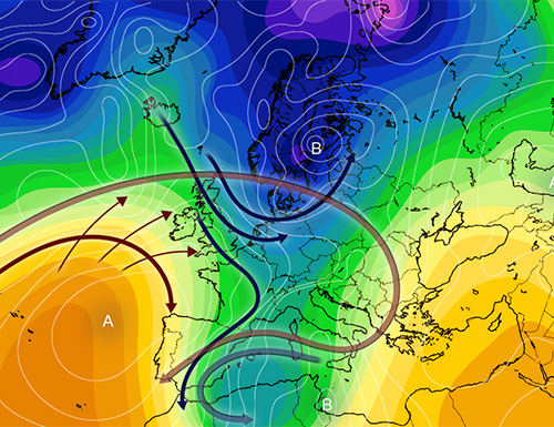 Scrutare troppo avanti nei forecast dei modelli, lo sappiamo, non serve a molto. Sussistono, talora, però, contesti in cui gli stessi modelli, se non proprio in modo uniforme, segnalano qualche movimento che è di interesse per come è da considerare come l’inizio di una nuova fase. La lunghissima fase atlantica, ora associata, per come visto in precedenza, ad onde di maggiore ampiezza, induce a verificare, infatti, quando la medesima finirà ed in che modo. E se le speranze dei freddisti continueranno a rimanere, molto probabilmente, speranze, ecco che spunta la possibilità che, quanto meno, si possa entrare in una nuova fase tra la fine della seconda e l’inizio della terza decade. La rimonta anticiclonica di segno atlantico che si intravede per quel periodo può anche far pensare al determinarsi di un disegno rex-blocking che entusiasma i freddisti, ma, in verità, l’eventuale fermo all’atlantico corrispondente, ammesso il suo realizzarsi, probabilmente non maturerà in quel senso. La dinamica che si intravede, infatti, segna piuttosto una estensione anticiclonica lungo una direzione sud-ovest/nord-est ma anche ovest/est, imposta da un sempre attivo forcing zonale alle medie latitudini, non certamente favorevole a blocchi ispiratori di richiami freddi in mediterraneo. Ecco che quanto può succedere allora è il movimento di una invadenza anticiclonica che rompe il flusso atlantico nord-occidentale o settentrionale producendo una circolazione negativa chiusa mediterranea dalla incerta evoluzione, per come è sempre incerta l’evoluzione di queste figure, ma destinata, in ogni caso, a disporsi tra mediterraneo, iberia e nord-africa. Stiamo, però, andando un pò troppo avanti, anche perché alcuni modelli questo tipo di trend lo intravedono molto meno così come intravedono molto meno l’eventuale blocco dell’atlantico. Di quasi sicuro, anche se al momento, c’è il fatto che di freddo non se ne parla, né per il medio e né per il lungo termine, a conferma di una stagione che, alla fine, se febbraio terminerà in questo modo, in termini di freddo non ha poi dato molto. Ha dato molto e darà molto per alcuni, ma solo sulla base delle loro totali fantasie o meteo invenzioni, senza senso e, al cospetto di una meteo seria, assolutamente vergognose o indecenti. Il mio disegno si riferisce alla situazione generale che alcuni modelli prevedono tra fine seconda ed inizio terza decade. Vi si può notare il profilo di una onda positiva in atlantico che prova ad espandersi ulteriormente ed il profilo di una saccatura estesa dai mari del nord al mediterraneo che affonda sino nell’entroterra africano e che tende a strozzatura; con la possibilità che detti movimenti maturino ulteriormente sino a cut-off sul basso mediterraneo ed invadenza anticiclonica su alto mediterraneo ed europa centrale (vedi frecce grandi)…