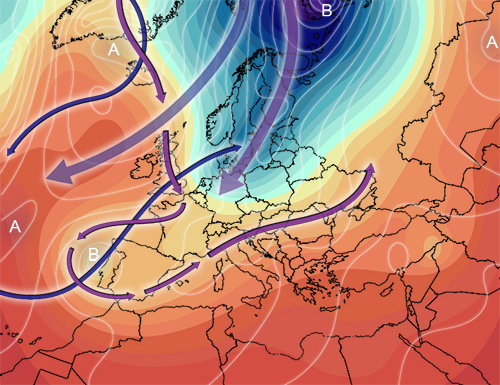 Il disegno della situazione generale prevista intorno ai giorni 16/17 è perfetto nel confermare quanto visto in precedenza. Esso infatti vede l’affermazione delle componenti settentrionali con una ampia saccatura dei mari del nord in progressione verso sud, con il consolidamento di alta pressione sul nord atlantico, e con l’aggancio del residuo della estesa circolazione ciclonica attualmente presente ad ovest dell’iberia. Una siffatta configurazione rappresenta una sorta di reverse rispetto alla situazione attuale. La situazione attuale, infatti, e per come indicato dalla simbologia delle frecce blu, vede la saccatura delle alte latitudini disporre il suo asse verso sud-ovest a prolungarsi nella circolazione depressionaria ad ovest dell’iberia sopra menzionata, ben ostacolata dal promontorio in mediterraneo. Come si conviene a questo tipo di dinamica la medesima circolazione ciclonica mostra anche una certa tendenza ad isolarsi o ad entrare in opposizione di fase rispetto alla stessa saccatura madre sui mari del nord. I forcing dominanti, però, tendono ad essere quelli che fanno capo a spinte del nord-atlantico, con la conseguenza di un progressivo cedimento del promontorio mediterraneo e con la graduale progressione della saccatura scandinava, associata a rotazione del relativo asse in senso antiorario, per come indicato dalla simbologia delle frecce che, dal colore blu a quello viola, segna la transizione dalla situazione attuale a quella del medio termine. Inevitabile allora, a partire dall’inizio della seconda metà del mese, un cambio meteo, inizialmente caratterizzato da una fase di correnti occidentali umide ed instabili e, tra fine seconda ed inizio terza decade, anche dagli elementi di una vera e propria irruzione con apprezzabili flessioni termiche, per quanto ancora da inquadrare in termini di intensità e di durata…