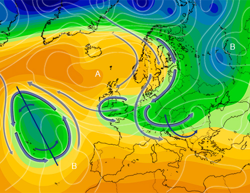 Con gradualità continua la stabilizzazione prevista con la tendenza nella direzione di alcuni giorni di stampo relativamente anticiclonico e primaverile, associati a relativa espansione di un promontorio afro-iberico. Tra fine seconda ed inizio terza decade i modelli indicano un cambio deciso di configurazione destinato non tanto a produrre chissà quale guasto sull’italia quanto, piuttosto, tutto un altro quadro barico e dei flussi su scala euro-atlantica. E questo in virtù di movimenti volti ad imprimere profili di netto stampo meridiano. Si possono infatti registrare, in proposito, un deciso affondo a largo sull’atlantico, un deciso rialzo barico alle alte latitudini del continente ed in spostamento verso ovest, e l’affondo, di segno continentale e dai mari del nord lungo l’europa centro-orientale, di una saccatura decisa ad acquisire un asse orizzontale od orientato lungo i paralleli. Questa ultima azione descritta, sulla base di dinamiche specifiche che caratterizzano spinte retrograde del genere che dissipano energia in senso anti-zonale, può risultare in una figura con fronte stazionario ed in un primo tempo destinata a guadagnare verso l’oceano piuttosto che verso latitudini più meridionali. E può presentarsi anche come una spinta in grado di agganciare l’estesa figura depressionaria frutto dell’affondo in oceano. Il destino di quello che appare come un esteso cut-off atlantico e della suddetta azione continentale non sembra, tuttavia, quello di due contesti programmati per entrare in interazione positiva. Le dinamiche evolutive, infatti, raccontano di un cut-off con asse in rotazione antioraria od in tilt negativo ed in allontanamento verso ovest e di una saccatura continentale che, può, alla fine, traslare verso sud-est, oltretutto a lambire la nostra penisola. Si tratta di due movimenti che depongono più per una opposizione di fase piuttosto che per il contrario. Ed ecco che, in questo modo, ai fini del tempo dei primi giorni di terza decade sulla penisola, può diventare importante proprio detta irruzione, non così in grado di coinvolgerci in maniera netta o diretta, ma, di sicuro, in grado di incentivare dinamiche di destabilizzazione, soprattutto tra il settentrione e la fascia adriatica. Il mio disegno indica la situazione generale prevista nell’immediato inizio di terza decade e cerca di spiegare, con l’aiuto della simbologia, il contesto ed il trend sopra descritti…