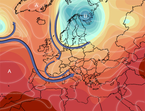 Quanto si legge sempre qua e là, a proposito di meteo e soprattutto nelle situazioni di cambiamenti con la possibilità anche di cambiamenti climatici drastici come in questo caso, è quanto mai vario e surreale. Si va dai soliti titoli che indicano la fine dell’estate alla menzione della possibilità di tempeste simil-tropicali o anche medicane, in un quadro davvero fantasioso. Ma quale fine dell’estate? Una rottura ad inizio terza decade di agosto come fa a costituire la fine dell’estate? Ma quale medicane? Il transito di una saccatura mobile lungo il centro-nord e con una sfuriata temporalesca cosa c’entra con situazioni da medicane ? Ho detto del cambio meteo. Si conferma, infatti, quanto già analizzato in precedenza ed a proposito dei due step destinati a rivoluzionare la situazione attuale quale quella di un sub-tropicale che ingloba buona parte del mediterraneo. Il primo step sta maturando ed è quello che vede una rimonta anticiclonica lungo l’europa occidentale destinata a disegnare un quadro da moderato flusso settentrionale tra adriatico e penisola balcanica; il secondo è quello che contribuirà ad affossare l’azione del sub-tropicale in maniera più drastica e caratterizzato da un rinvigorito forcing oceanico capace di trasformare l’attuale cut-off in atlantico in una saccatura mobile. Detta saccatura, in veste di diramazione di una area depressionaria ben più profonda disposta alle alte latitudini, appare in grado di muovere verso levante e di coinvolgere il nostro centro-nord intorno a metà settimana, con il risultato di un break di tutto rispetto. Un evento che farà anche da elemento introduttivo di una configurazione zonale, occidentale o nord-occidentale, che, pur se potrà corrispondere anche a riprese anticicloniche, corrisponderà, nel contempo, a qualcosa di attinente alle azzorre, ad una dominante oceanica, ed eventualmente a variabilità con la possibilità di ulteriori transiti di instabilità. Il disegno si riferisce alla situazione generale prevista intorno ai giorni 20/21 ed illustra il transito della saccatura nonché, con il supporto della simbologia, il contesto prospettico descritto…
