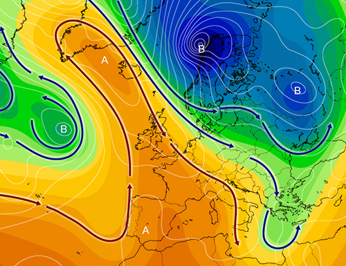 La configurazione meridiana indicata in precedenza è il quadro meteo destinato ad interessare lo scacchiere euro-atlantico nei prossimi giorni. Le due figure depressionarie, ed ovvero la discesa fredda sull’europa orientale ed il cut-off oceanico, confermano di non voler interagire, ed anzi, di voler lasciare spazio al classico profilo in cui una figura anticiclonica allontana e pone in opposizione di fase le due circolazioni negative. Il cut-off atlantico, infatti, tende ad allontanarsi sempre di più dalle faccende continentali, orientato a muovere in senso retrogrado verso nord-ovest ed a essere inglobato dal flusso dominante oceanico tendente a correre sull’alto atlantico da sud-ovest a nord-est. E’ invece il flusso settentrionale della struttura dinamica depressionaria che coinvolge buona parte dell’europa centro-orientale, contestualizzabile in una ampia saccatura associata ad impulsi od onde secondarie successive che corrono da nord o nord-ovest verso sud o sud-est, a poter risultare influente, almeno marginalmente o in parte, per le nostre regioni. Tant’è che, a dispetto di una evoluzione che non vede relativi affondi diretti e che vede, invece, un’alta pressione decisa a mantenere ad est detto flusso settentrionale, avremo molto probabili disturbi, su settentrione ed adriatico in primis, indicativi di dette infiltrazioni da nord, ma non certamente dei veri e propri guasti da decisi affondi sulla penisola. Il disegno della situazione prevista intorno a metà terza decade, od intorno ai giorni 24/25, è ben indicativo della situazione descritta, costituita dal tipico profilo settentrionale che coinvolge la parte nord e di levante del continente, fino ad estendere la sua influenza su balcani e mediterraneo orientale. In quei giorni, tra l’altro e per come si vede, tocca ad una certa curvatura anticiclonica il compito di subentrare all’onda ciclonica che ci ha lambito e che è scivolata a sud della grecia, nell’ambito di un tempo che, a dispetto delle infiltrazioni suddette, anche foriere di eventuali riduzioni delle temperature, tende a mantenere una connotazione generale relativamente in linea con gli elementi climatici del periodo…