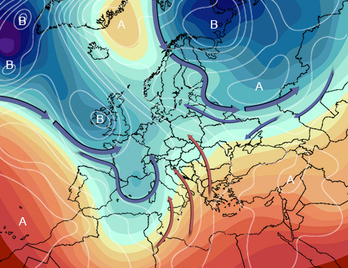 Sulla legittimità di pagine che, pubblicamente e con modi ironici, mettono in luce e criticano quanto, in termini di materiale meteo, è pubblicato sulla rete e considerato non appropriato per qualche motivo, non mi pronuncio perché non sono un esperto di leggi. So, però, una cosa. E so che se, dopo aver fatto uno dei miei semplici e, da semplice appassionato, editoriali meteo, mi vedessi su una di quel tipo di pagine prima di arrabbiarmi analizzerei bene quanto ho scritto onde verificare eventuali inesattezze, errori, strafalcioni, stravaganze. In ogni caso penso che, data la totale assenza di controlli o censure di tipo istituzionale, per quanto si vede e si legge in rete, ben venga, al netto della opportunità di criticare con modi consoni e legittimi, ogni tipo di critica, anche ironica. Ognuno, naturalmente, è libero di giudicare le cose a suo modo; e c’è anche, ad es., chi continua a fare complimenti a previsori che insistono da anni nel vedere e prevedere storiche ondate di freddo che rimangono, ogni volta, nei sogni. Ma se per un mese in parecchi hanno urlato al gelo e a un gennaio di altri tempi, sulla base di carte di lungo termine che, come si sa, hanno il valore che hanno, ed hanno, in alcuni casi, insistito anche quando le medesime carte hanno cominciato a mostrare tendenze meno freddisticamente entusiasmanti, la vogliamo o no, certa meteo, definire, come urlata, sensazionalista, poco realistica ? Esprimo, sempre e naturalmente, il mio personale parere. E dico che, si, lo possiamo e dobbiamo dire, senza mancare di rispetto a nessuno, nei limiti della critica legittima e, evidentemente, facendo, in questo modo, credo, anche il bene dell’informazione. Ed ecco perché il mio livello di attenzione, e non da oggi, verso ciò che, in generale, compare sulla rete, è inversamente proporzionale al grado di urlo o di clamore nonché al grado futuristico se si tratta di previsioni. A tutto questo discorso si conforma, perfettamente, l’evoluzione che si prospetta da qui a fine mese, evoluzione che sconfessa anche le ultime, residue, illusioni fredde, negando, per l’ennesima volta, a molti, la possibilità di vedere realizzate certe loro previsioni o indicazioni precedenti tinte di bianco, di ghiaccio, di siberia e di similari. Perché se in meteorologia il realismo e la prudenza sono elementi obbligati va da sé che siano molto da considerare il basso valore di mappe oltre i 7 giorni ed il valore della statistica che, come si sa, tra le varie ipotesi sul tempo mediterraneo ed italico, non privilegia di sicuro le ondate di freddo storico. Ma tutto può ancora succedere? Beh, non metto mai limiti alla provvidenza. Ma da freddista il vedere che il flusso freddo si allontana sempre di più, si spinge a latitudini sempre più elevate, e che prevale, con le sue depressioni e le sue componenti di ovest, sud-ovest, o anche sud, il grande atlantico, non mi viene di pensare a chissà che cosa e di farmi illusioni, quanto meno. Il disegno mostra la situazione generale prevista intorno ai giorni 24/25 ed è eloquente nel descrivere e rappresentare la tendenza di fine mese descritta…