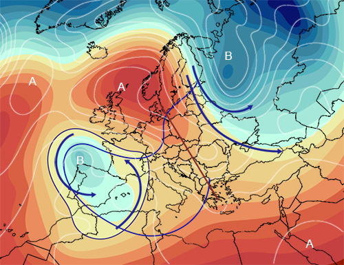 Il tempo fa il suo corso e non da certamente retta a quanto i modelli indicano a 5-7-10 giorni. Le analisi di medio e, soprattutto, lungo termine sono calcoli rispettabilissimi ma sempre da considerare ancorati a determinati valori di probabilità. E come detto in precedenza è certamente legittimo esaminare dette analisi ma senza presentare le medesime come quasi certezze o urlare, entusiasti, alla grande situazione che esse presentano. Tutto questo ce lo dimostra, per l’ennesima volta, quanto accaduto negli ultimi giorni e nelle ultime ore. Giorni fa più modelli mostravano la possibilità, dopo natale, e/o oltre, di afflussi freddi di una certa consistenza. Le ultime analisi detta possibilità la sfumano molto, pur confermando quel pò di inverno da me tracciato in precedenza. Il rex blocking sul continente, come apportatore di correnti fredde in mediterraneo, ha il suo teorico valore, ma poi occorre sempre inquadrarne la disposizione nonché l’evoluzione. Evoluzione che, in questo caso, propone qualcosa di poco gradito ai freddisti, ed ovvero una preliminare allettante situazione di depressione mediterranea che tende a richiamare correnti orientali o nord-orientali, seguita, però, da una invadenza anticiclonica che detta circolazione la delocalizza ad ovest, isolandola e chiudendo, almeno in buona parte, alle stesse correnti dell’est. Il mio disegno, relativo alla situazione generale prevista a 48 ore, inquadra perfettamente il contesto sopra descritto in cui risulta, infatti, ben evidente, in quota, la separazione tra la depressione mediterranea in spostamento verso ovest e la saccatura fredda sull’europa nord-orientale. Tra le due configurazioni si interpone una sella o una disposizione relativamente anticiclonica che fa da area di separazione, ponendo le due circolazioni negative in opposizione di fase. Inutile segnalare la possibilità, comunque, di un certo richiamo balcanico al suolo, soprattutto sul mediterraneo settentrionale, ma moderato e, certamente, tutt’altro che in consolidamento. Visto il contesto ciclonico mediterraneo non è di sicuro da escludere un momento di segno invernale con venti dai quadranti orientali e tempo molto incerto, ma è sicuramente da escludere, almeno nel breve/medio, la possibilità di un afflusso freddo significativo. Che i freddisti, comunque, non disperino, perché l’aria artica ci riproverà, e magari tra fine anno e capodanno o, più probabilmente, ad inizio gennaio. Ma stiamo parlando di lungo termine, e, dunque, di analisi tutte molto da verificare nei prossimi giorni e, come sempre, da prendere con le dovute molle…