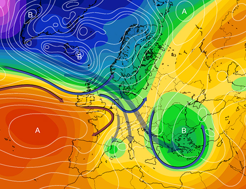 Si conferma la fase di matrice settentrionale già esaminata in precedenza e che potrebbe persistere anche nel corso dei primi giorni del prossimo mese. Detta fase appare, quanto meno nel corso dei prossimi giorni, ancorata alla tipica configurazione in cui il flusso euro-atlantico dominante in quota si colloca lungo una direttrice disposta dall’alto atlantico ai balcani. Il che significa che le onde negative ad esso associate, equiparabili ad impulsi o ad irruzioni, coinvolgono soprattutto i balcani ed il mediterraneo centro-orientale. La non trascurabile ingerenza dell’anticiclone oceanico, forte di valori apprezzabili ben distribuiti sino alle latitudini dell’islanda ed esteso in longitudine sino all’europa occidentale, contribuisce al quadro di un tempo variabile, con la instabilità più marcata relativamente limitata ai settori orientali. Per quanto gli effetti delle irruzioni possano essere avvertiti anche sul lato tirrenico e sia difficile prevedere la possibilità di estensioni verso occidente, in detti casi le temperature sotto media ed il tempo più perturbato si avvertono generalmente soprattutto più ad est. Va da sé in ogni caso e, più o meno, per tutta la penisola, che configurazioni come questa, mobili lungo un flusso settentrionale o nord-occidentale ed in grado di richiamare aria dai mari del nord, fredda soprattutto in quota, sono foriere di una stagione che stenta ad esplodere e che regala, invece, seppur in maniera relativa, elementi da tardo inverno. Naturalmente, vista l’evoluzione che non intravede blocchi con estensioni anticicloniche scandinave ma, piuttosto, la persistenza del flusso dominante nord-ovest/sud-est o nord/sud sopra indicato, nulla di eclatante e, in generale, qualcosa che attiene agli sbalzi ed alla dinamicità tipiche del mese in questione. Nel corso dei giorni che ci conducono a fine mese gli impulsi o le saccature in discesa lungo balcani e mediterraneo centro-orientale potranno essere anche più di una, e senza escludere la possibilità di infiltrazioni in grado di allargare il coinvolgimento ad aree più ad ovest. Vedremo, poi, quanto, detta situazione, sarà in grado di persistere o sarà in grado, addirittura, di acuire i toni con qualcosa di più nord-orientale nel corso dei primi giorni di aprile. Il disegno mostra la configurazione generale prevista intorno ai giorni 28/29, con la circolazione ciclonica in quota sui balcani figlia dell’irruzione incipiente, con il segno di una più debole infiltrazione al seguito che si allarga verso le baleari e con il chiaro profilo, enfatizzato dalle frecce, del contesto settentrionale e del flusso che muove, lungo una direttrice nord-ovest/sud-est, dal nord-atlantico alla penisola balcanica, con impulsi successivi…