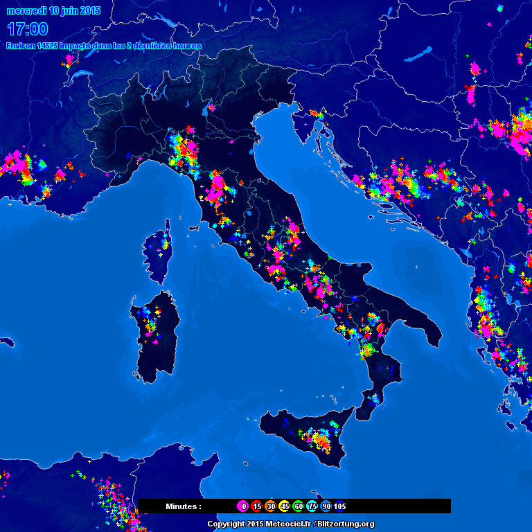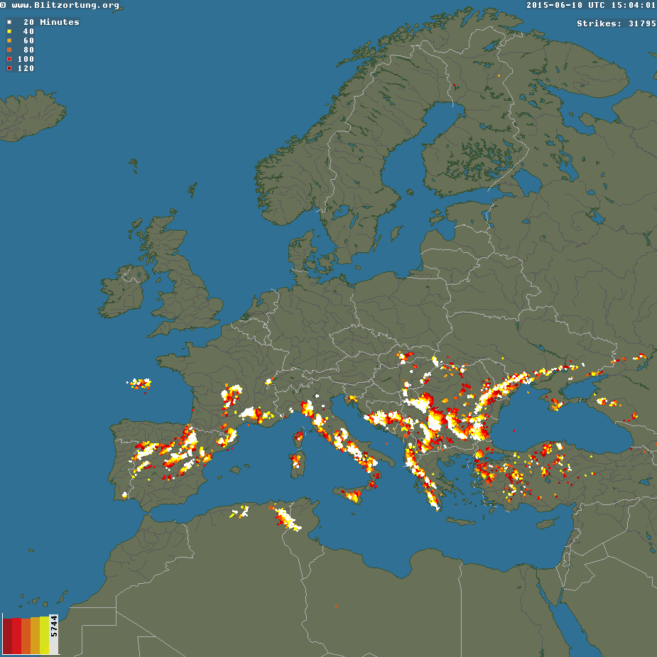 Dalla fig.4 si evince come, esattamente da previsione, l’instabilità che è aumentata nel nord Appenino, con correnti sudoccidentali instabili in entrata, e diminuita nei rimanenti settori peninsulari, meno soggetti quindi a correnti fresche orientali. I valori massimi delle temperature inoltre, si mantengono quasi esclusivamente <30° C, in particolare al nord, dove è praticamente terminata l’ondata di caldo. Nel quadro europeo una menzione particolare merita l’immagine delle fulminazioni pomeridiane, da cui si evince come l’instabilità sia concentrata al di sotto del 50° parallelo e sui rilievi, mentre più a nord è presente, al momento, una fascia altopressoria stabilizzante (fig.5).
