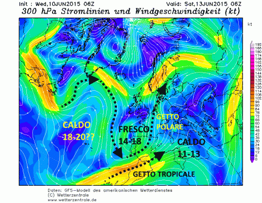 1) 11-13 Giugno, promontorio africano al centrosud, caldo in aumento con massime nuovamente >30° C nelle aree interne; più fresco e instabile al nord, specialmente settori occidentali, con temporali