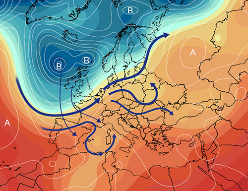 L’aspetto principale della situazione e della evoluzione dei prossimi giorni risiede nel fatto che la possibile espansione anticiclonica dicembrina sull’europa occidentale, intravista dalle analisi di lungo termine di giorni fa, non sembra concretizzarsi. Sembra, invece, che possa continuare una fase sostanzialmente atlantica, o, comunque, aperta alla possibilità di infiltrazioni successive dall’atlantico o dal nord-atlantico. Mentre tende ad andare in archivio l’azione del cut-off o della depressione mediterranea, ancora presente sul mediterraneo centrale e frutto di una di tali infiltrazioni oceaniche, c’è da considerare che la prossima infiltrazione, imminente, potrebbe non risultare particolarmente incisiva e perdersi in un’affondo iberico piuttosto meridiano e destinato ad indebolimento. Un fatto, questo, però, che non annulla il proposito oceanico di insistere nel muovere azioni depressionarie in direzione di iberia e di mediterraneo occidentale. Tant’è che c’è da mettere in conto una previsione di azioni atlantiche successive destinate a fare dell’area mediterranea medesima un’area di tempo tutt’altro che stabile o, quanto meno, variabile e, senz’altro, associato a fasi con passaggi di sistemi nuvolosi e di piogge, proprio nel corso dei primi giorni del mese. Il disegno, che si riferisce alla situazione generale prevista ad inizio mese, mostra, con il supporto della simbologia, il quadro sopra descritto, che è quello di una porta atlantica relativamente aperta ed in grado di consentire moderate infiltrazioni di aria umida ed instabile. In qualche modo potrebbe non trattarsi di affondi così marcati, e questo in virtù di un campo barico delle basse latitudini poco propenso a cedimenti particolarmente significativi. Ma c’è sempre da tener conto della imprevedibilità che la stessa orografia mediterranea offre ogni volta che la relativa area diventa obiettivo totale o parziale dell’atlantico…