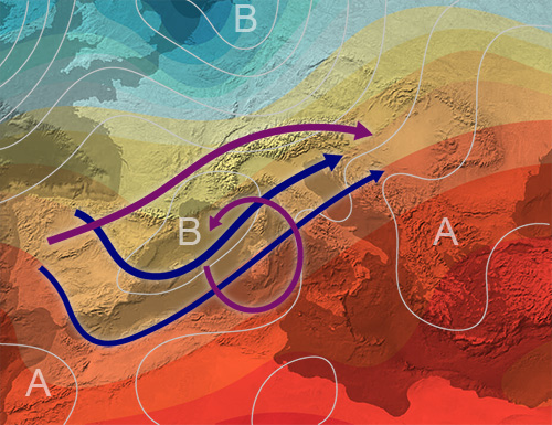 Certe evoluzioni meteo meritano di essere commentate anche per come presentano elementi dal valore didattico. In questo caso, anche a conferma di quanto già esaminato in precedenza, siamo di fronte ad una situazione tipicamente occidentale atlantica, certamente foriera di condizioni umide ed instabili ma anche un pò ostacolata da una certa presenza del sub-tropicale. Di fatto, senza riuscirci, almeno per ora, in pieno, le onde negative collegate alla fascia depressionaria oceanica muovono da ovest ad est trovando, al livello delle latitudini mediterranee, condizioni non troppo favorevoli ad un affondo franco e marcato dal punto di vista barico e della ciclogenesi. Ed è anche per questo che dette ondulazioni possono finire per impantanarsi ed isolarsi dalla corrente zonale principale. Con valori barici non così bassi l’affondo si verifica; ma si verifica ostacolato e costretto a scivolare verso sud e per ragioni di dinamica, a diventare una circolazione chiusa. I cut-off, sia ciclonici che anticiclonici, fanno parte della normale fisiologia degli scambi termici atmosferici e rappresentano uno degli scambi più significativi e marcati. I cut-off ciclonici, poi, rappresentano, non infrequentemente, una insidia meteo non indifferente giacché capaci di produrre maltempo persistente sulle stesse aree. In certi casi, tuttavia, detto isolamento evolve nell’ambito di situazioni tali da indebolirne l’azione ed anche da favorirne un certo spostamento. Il tempo variabile o anche perturbato delle prossime 24/48 ore è da ascrivere proprio ad una evoluzione del genere. La debole saccatura andrà sempre più assumendo la connotazione di semplice e modesta diramazione, affondando in mediterraneo centro-occidentale e, quindi, isolandosi dalla corrente principale, assumendo le caratteristiche di cut-off o goccia fredda in lento spostamento verso sud o sud-est. E tutto questo anche in un contesto sfavorevole capace di indebolirne gradualmente gli effetti. La metafora del torrente che incontra condizioni favorevoli al dilatarsi in un’ansa che poi, successivamente, si isola formando una pozzanghera staccata dal corso dello stesso torrente rende abbastanza, seppur grossolanamente, l’idea del fenomeno. E d’altra parte sempre di fluidi che obbediscono alle stesse regole di dinamica, pur con lo dovute ed anche notevoli differenze, si tratta. Il disegno mostra la situazione generale di questa mattina e mostra, con le frecce, la transizione sopra esaminata, ed ovvero quella della modesta saccatura (frecce blu) che evolve in cut-off (frecce viola)…