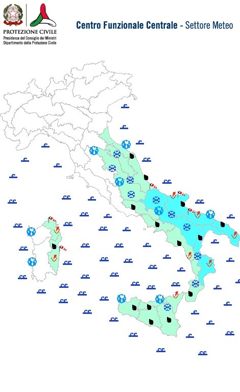 – sparse, anche a carattere di rovescio o temporale sul resto del Sud, su Marche, Abruzzo, Molise e settori orientali di Umbria, Lazio e Sardegna, con quantitativi cumulati da deboli a moderati;