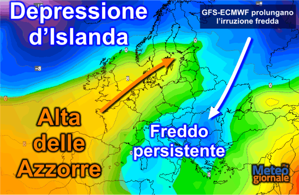 Il nostro elaboratore è in grado di fornirci la media dell’ultima corsa disponibile nel MultiModel GFS-ECMWF, il quale indica – per la giornata di lunedì 9 marzo – una persistenza dell’aria fredda anche in Italia. La causa è imputabile all’inclinazione a nordest del blocco anticiclonico azzorriano e all’isolamento di una circolazione fredda secondaria sul Mediterraneo centro orientale. Oltre al freddo, chiaramente invernale, potrebbero persistere precipitazioni nelle aree esposte ai venti di Grecale e le nevicate sarebbero in grado di spingersi a bassa quota. Probabilmente sino in collina.
