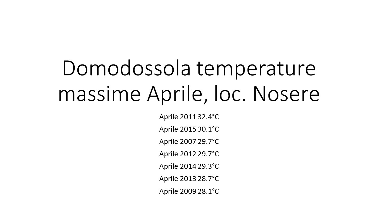 Pazzo Aprile, altro che marzo. Valori eccezionali negli anni addietro, ora sono la norma. La primavera è la stagione intermedia che più di tutte ha subito i valori mediamente più alti nel riscaldamento globale, ( 1.5°C/secolo) leggermente inferiore in inverno (1.4°C/secolo) ed estate (1.3°C /secolo) e in minor modo in autunno. (1.1°C /secolo) Aprile sovente è quello che registra le temperature più alte rispetto alle medie storiche. Oggi Domodossola 30.1°C alla stazione meteorologica in località Nosere, Arpa Piemonte, in 25 anni le seconda mai registrata. Le prime sette temperature più alte registrate negli anni 2000.