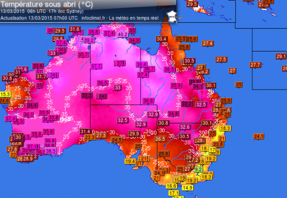 Il 13 marzo record nuovamente ritoccato a Middle Point con 38°C, e altri record a Douglas River con 38°C e Bradshaw con 41°C. Record mensili anche nell’Australia Occidentale, 44,7°C a York e 40,4°C a Jacup.