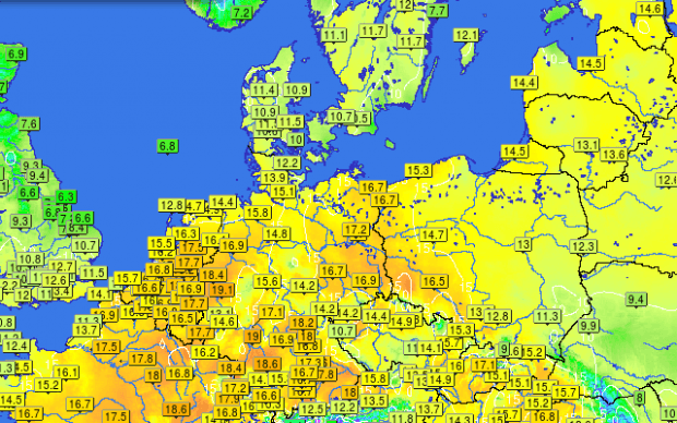 Anche in Germania il 17 marzo è stata una splendida e calda giornata di primavera, anche se in alcune zone le inversioni termiche hanno favorito minime piuttosto basse e qualche gelata. 19,9°C la massima a Oehringen, 19,1°C a Koeln/Bonn AP (-0,9°C la minima), 19,0°C a Mannheim, 18,6°C a Stoccarda, 18,4°C a Duesseldorf (minima -0,9°C), 18,2°C a Bamberg, 18,0°C a Norimberga, Cottbus e Potsdam, 17,8°C a Monaco, 17,6°C a Wuerzburg, 17,5°C a Berlino/Dahlem e Kempten. Oehringen è stata tra le 20 località più calde di tutta Europa! In Germania i record mensili sono diffusamente attorno ai 25°C.