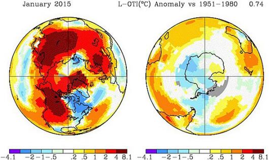 Gennaio 2015 prosegue il trend del 2014, risultando a livello globale particolarmente caldo. Sia la NASA che la NOAA hanno confermato che il primo mese del 2015 è risultato il secondo Gennaio più caldo per quanto riguarda l’anomalia di temperatura terra/oceano a partire dal 1880. L’anomalia complessiva combinata terra/oceano è risultata di +0.75°C per la NASA e +0.77°C per la NOAA, seconda solo al Gennaio 2007 (+0.93°C/+0.86°C)