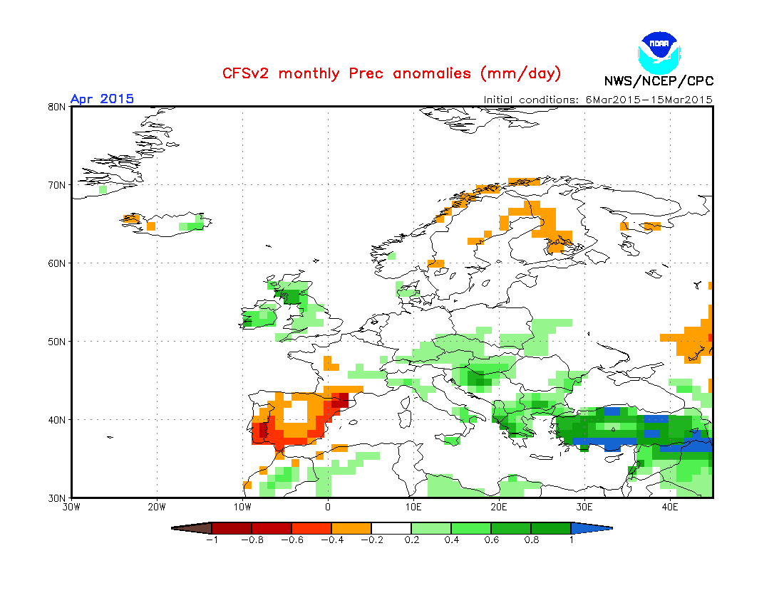 Anche la mappa delle precipitazioni non mostra significative anomalie, se non una piovosità poco superiore alla norma tra il nordovest e la Toscana e sulle regioni meridionali, insomma… nulla di eclatante o di straordinario, tanto più che si arriverà da un mese di marzo che, specie al nord, come sappiamo dalla mia precedente analisi e come stiamo sperimentando sarà piuttosto avaro di precipitazioni (siamo infatti al giorno 17 e sinora è piovuto per solo un paio di giorni su gran parte del nordovest, a fronte di una media mensile di 8-9 giorni con precipitazioni).