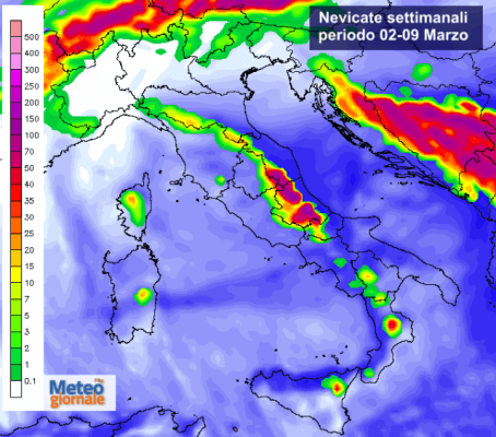 Ed allora con l’ausilio del nostro modello ad alta risoluzione andiamo a vedere dove e quanto potrebbe nevicare. Le proiezioni hanno un arco temporale settimanale: da oggi fino a lunedì 09 marzo. Non scordiamoci che le nevicate vengono rappresentate dalle tonalità dal verde al porpora, mentre in blu abbiamo le piogge. Ciò detto, è evidente come stavolta saranno i rilievi appenninici a fare il pieno di neve.