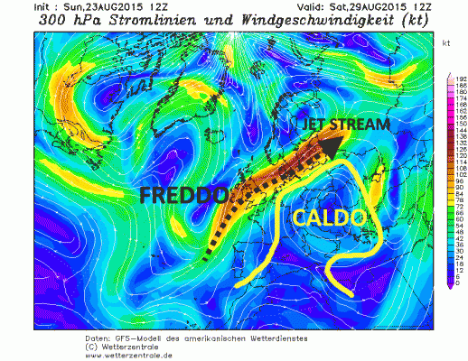 Per tale motivo, le temperature non potranno raggiungere i valori molto elevati registrati nella prima parte dell’estate, mantenendosi di poco superiori ai 30° C, con punte di 33-34° C nella pianura Padana orientale. Dalla carta delle correnti a getto, si evince come il nucleo più intenso dell’alta pressione di andrà a intestare sui Balcani, con innesco di moti subsidenti anche nelle regioni italiane, che incentiveranno la potenza dell’ondata di caldo (fig.5).