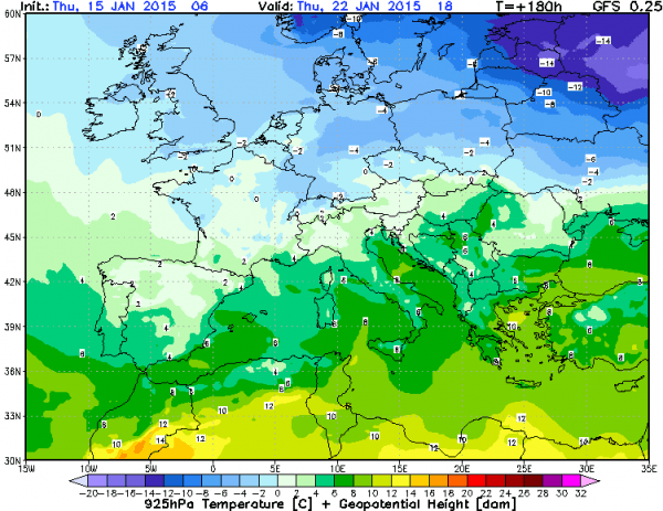 Questa mappa attesa per la serata di giovedì 22 rappresenta il momento più “freddo” in cui alla superficie isobarica di 925 hPa (circa 800 metri di quota) le temperature sono positive su tutto il versante padano e sul Mediterraneo (si vede invece il “freddo” confinato oltralpe”):