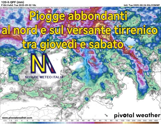 Nelle prossime 24/36 ore saranno probabili delle abbondanti piogge nelle regioni settentrionali e su parte di quelle centrali, a causa di forti contrasti termici tra il richiamo molto caldo nord africano e l’aria piu’ fresca di origine oceanica.