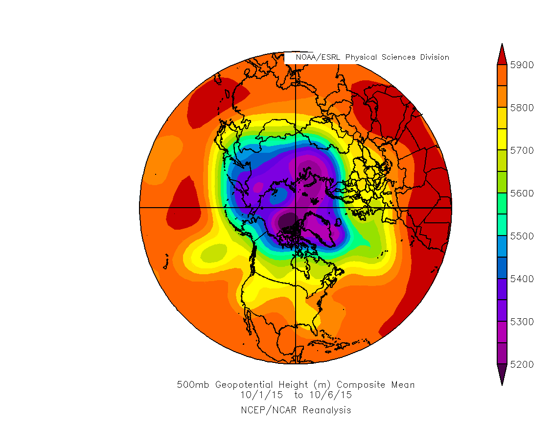 Fig. 3a Media del geopotenziale a 500 hpa dei primi giorni della prima metà del mese di Ottobre 2015. Possiamo notare un displacement del vortice polare sul continente euroasiatico preceduto dall’accorpamento del vortice polare dapprima sul settore atlantico-goenlandese.