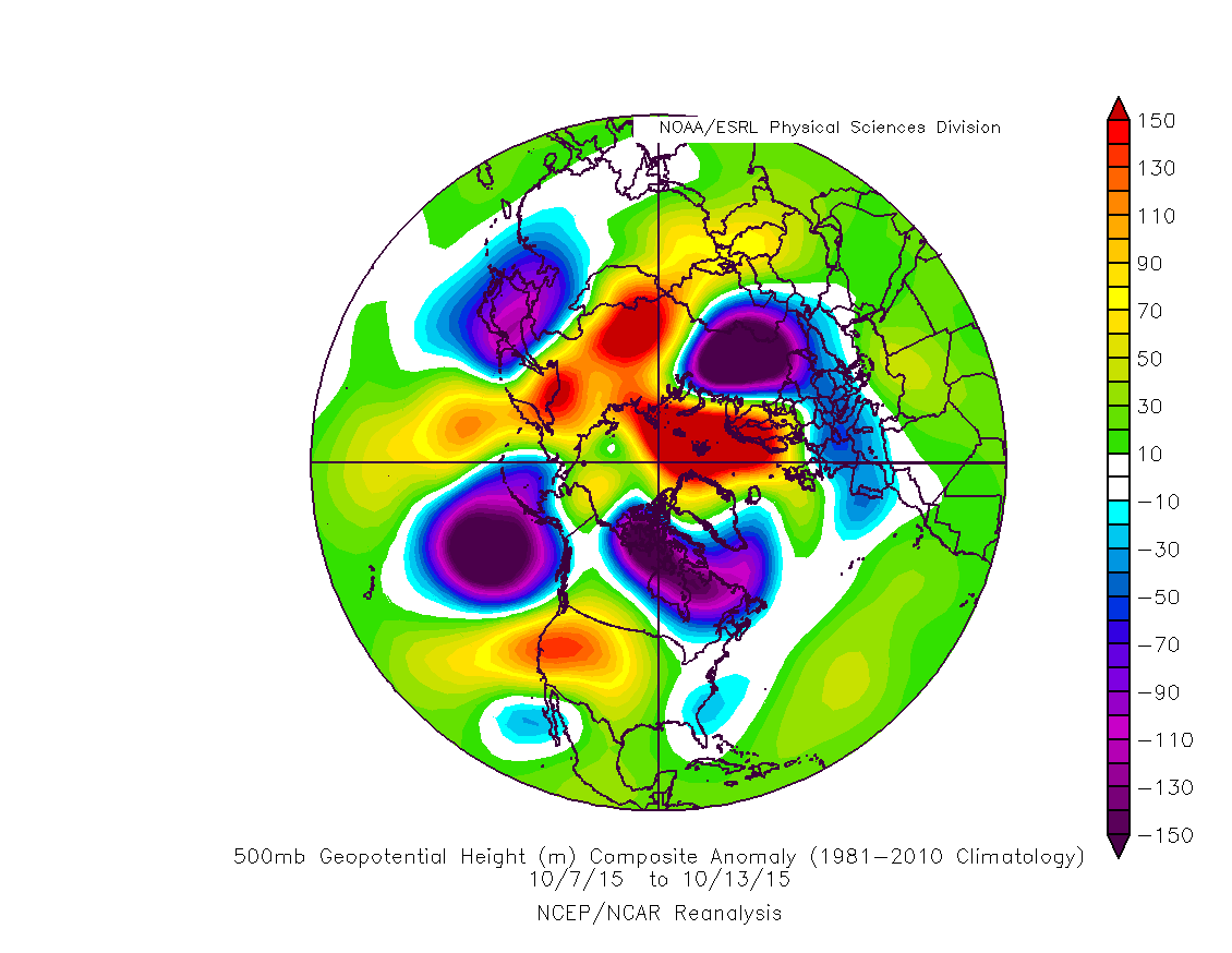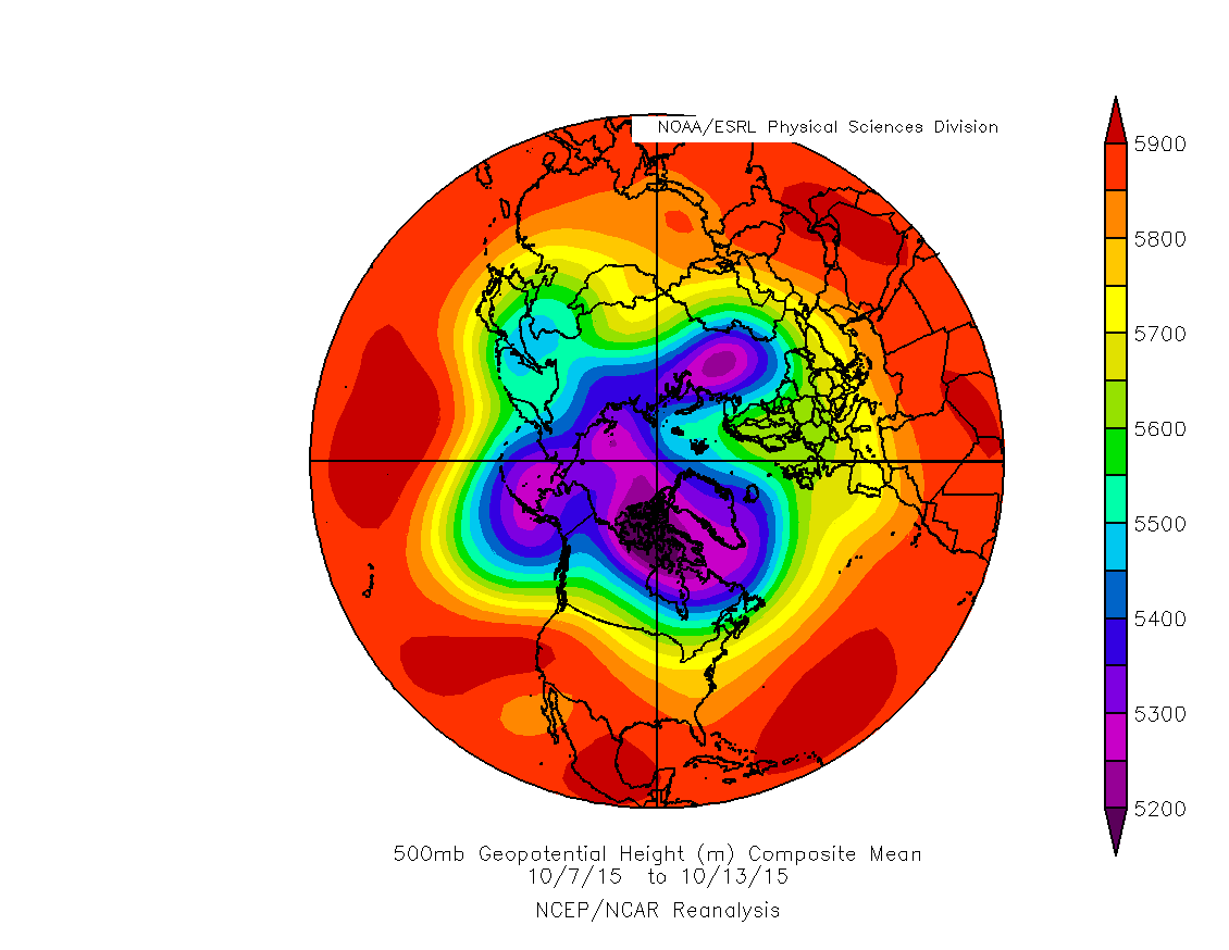 Fig. 4a Media del geopotenziale a 500 hpa degli ultimi giorni della prima metà del mese di Ottobre 2015. Possiamo notare anche in questa immagine come successivamente alla fase di displacement l’onda atlantica riesca ad essere intrusiva fino alle zone polari.