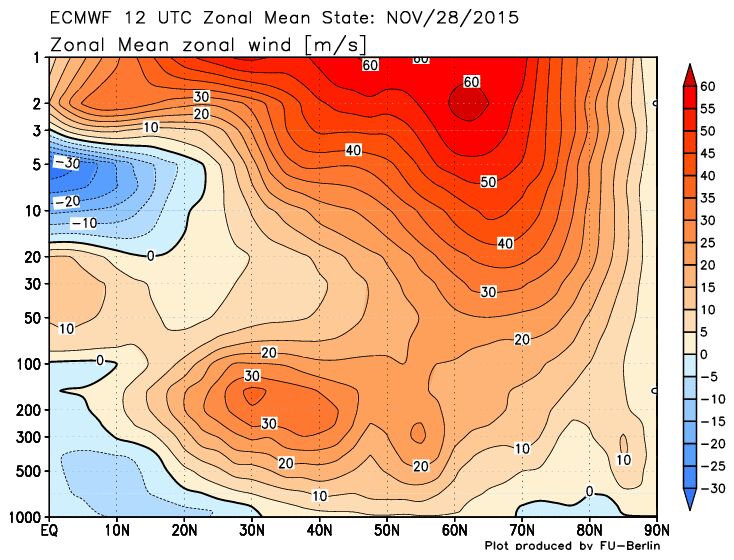 Fig.5 Stato attuale delle velocità zonali. Dalla carta si denota una condizione di elevate velocità zonali in area polare.