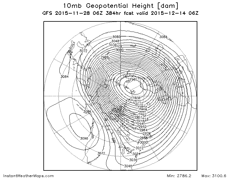 Fig. 2 Si nota una wave 1 che verso la metà dicembre tenderebbe a traslare verso l’il nord America favorendo il displacement del vortice.