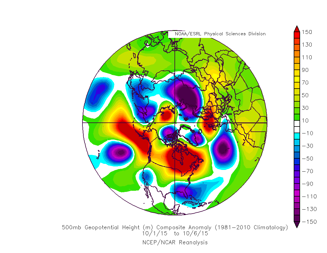 Fig. 3 Anomalia geopotenziale a 500 hpa dei primi giorni della prima metà del mese di Ottobre 2015. Possiamo notare un displacement del vortice polare sul continente euroasiatico.